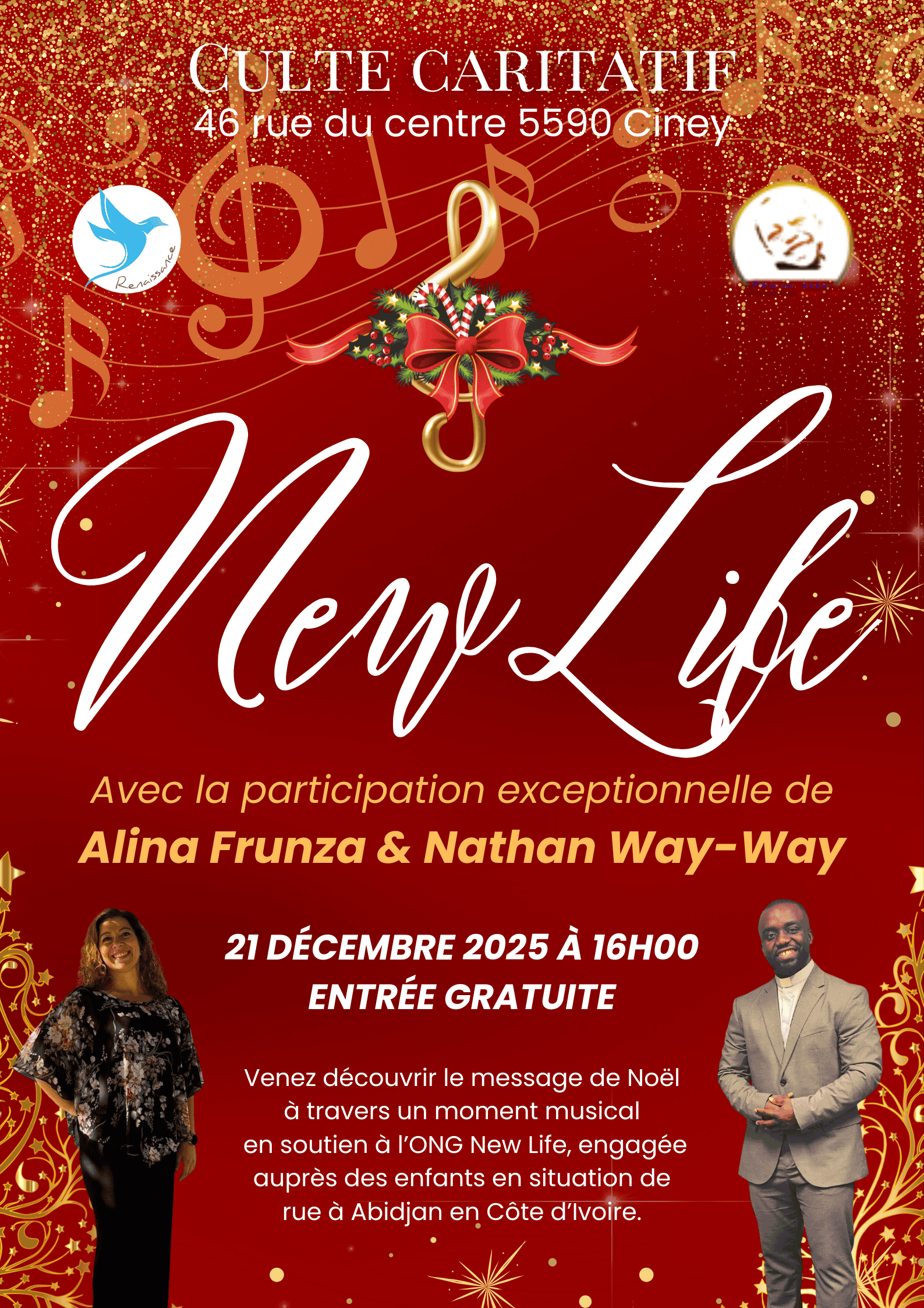 Le dimanche 21 décembre 2025 à 16h00, un culte caritatif exceptionnel se tiendra au 46 rue du Centre, 5590 Ciney. Cet événement, placé sous le thème « New Life », promet un moment chaleureux, musical et porteur d’espoir à l’approche des fêtes de Noël. Avec la participation exceptionnelle de Alina Frunza et Nathan Way-Way, cette célébration sera l’occasion de découvrir le message de Noël à … Lire la suite